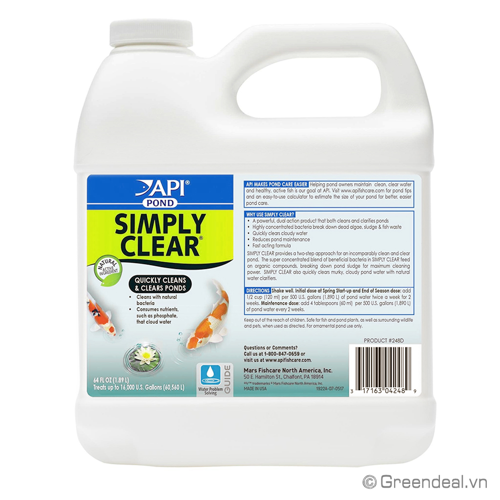API - Pond Simply Clear giúp làm sạch ao hồ dựa trên các chủng vi khuẩn tự nhiên, sẽ nhanh chóng làm sạch nước bị đục và giữ cho chất lượng nước được trong xanh.